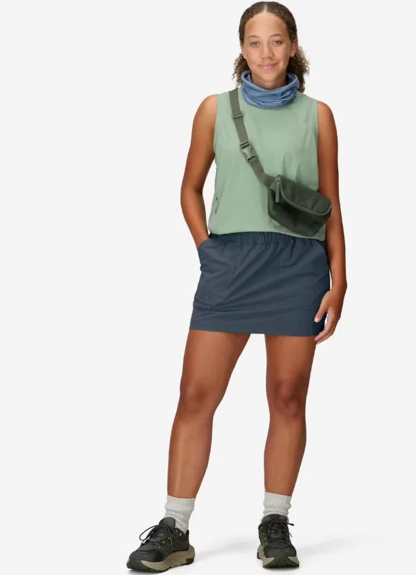 Дамска пола-панталон Marmot AirExchange Skort – елегантна и функционална комбинация от пола и вътрешен шорт. Изработена от бързосъхнеща и дишаща материя с AirExchange™ технология и UV защита UPF 25, подходяща за туризъм, пътувания и ежедневие.